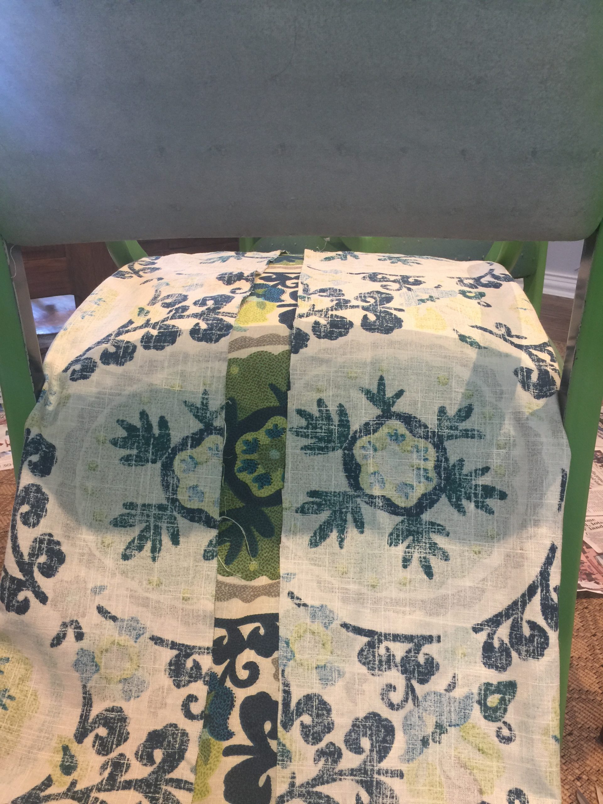 I did not have enough fabric to also cover the back side of the chairs, so picked out something else from my pile of fabrics.