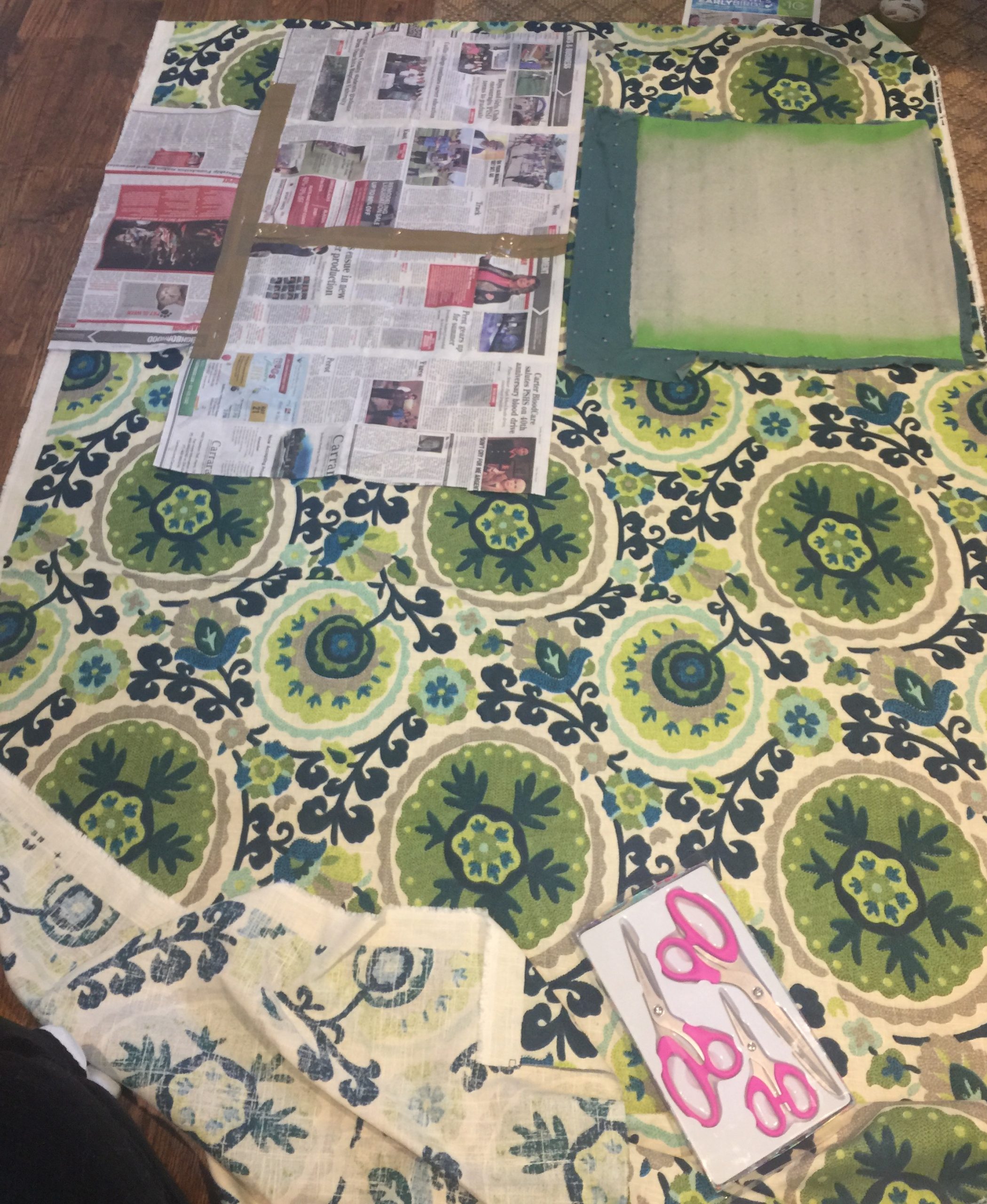 Here is a little secret about me…I have analysis paralysis. So, when it came to cutting the fabric, I spent lots of time analyzing before cutting. Growing up with a wood working father I learned, measure twice, cut once. This lesson applies to wood and fabric alike. So, I unfolded my fabric onto the floor and looked at it. I got some newspaper and laid it out on the chair to make a pattern. I taped some newspaper together and trimmed it up until I had a pretty good idea of how big of a piece of material I was going to need. Since I had two chairs, I wanted to make sure my patterns would fit twice on the fabric. I also looked at the pattern of the fabric to determine how I wanted to line everything up. Since the fabric had large circles, I wanted to center them width wise on the chair. I was worried about cutting the fabric too large for the bottom cushion and not leaving enough fabric for the back. I ultimately decided the width I’d need and cut that section off of the fabric. I used that section for the bottom and back cushions, but I did not cut it apart until after I attached the fabric to the bottom cushion. (This is hard to put into words, so check out my pictures below.)