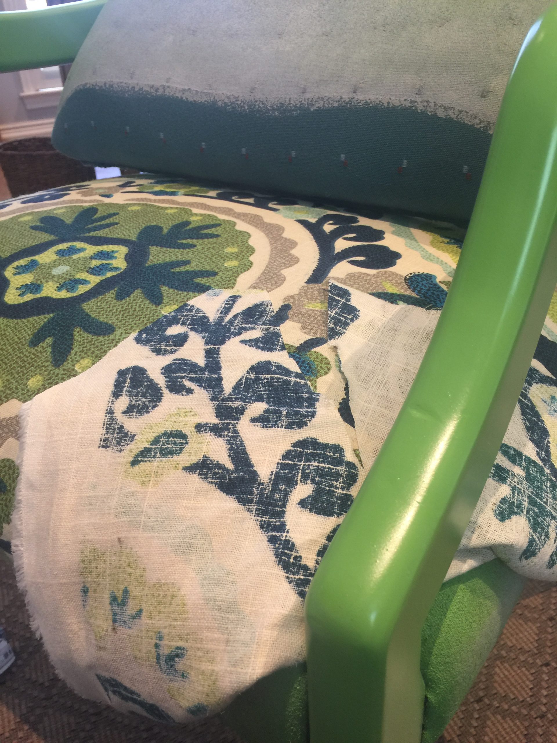 When I decided to give my home office a refresh, I reunited them. I retrieved one from my closet and the other from my husband’s break room. I’ve been looking at them for months, trying to decide what I was going to do to give them new life. I actually painted the fabric on one of them. (That’s a story for another time, though.) I got out all the fabrics I’ve been hoarding to see if there was anything I liked for these chairs. I decided on this green and blue modern floral design because it had a lot of pop and I thought I had enough to cover both chairs.