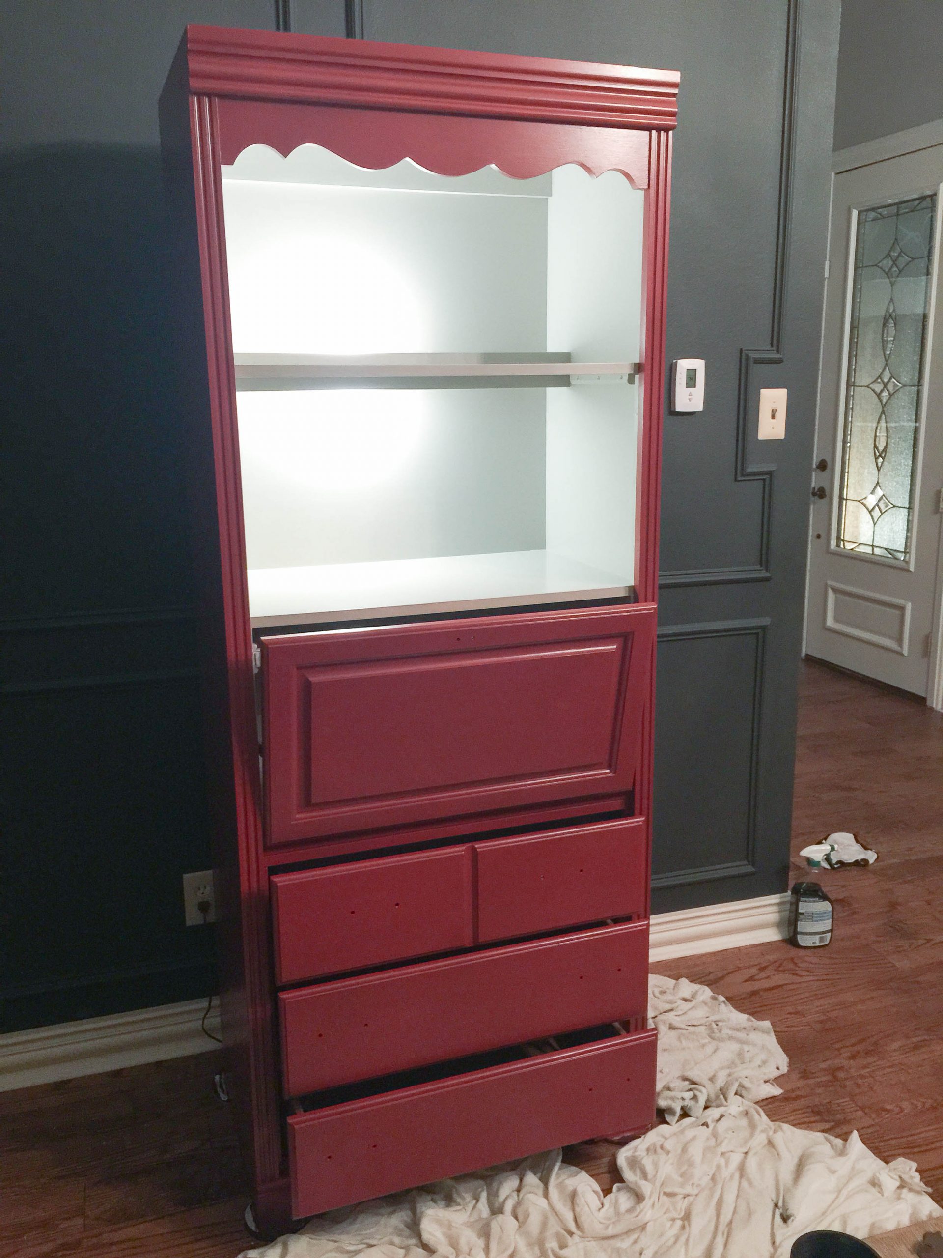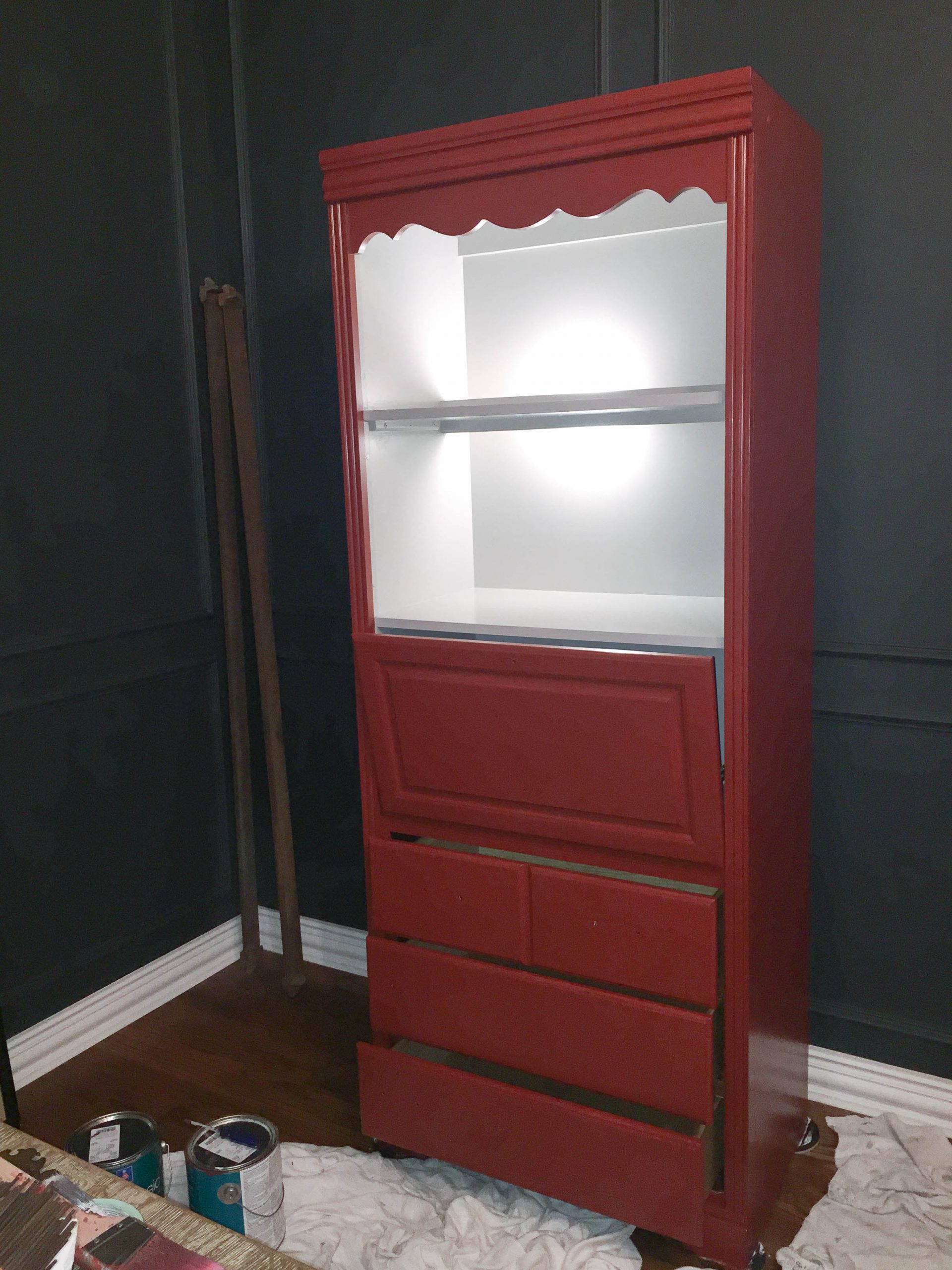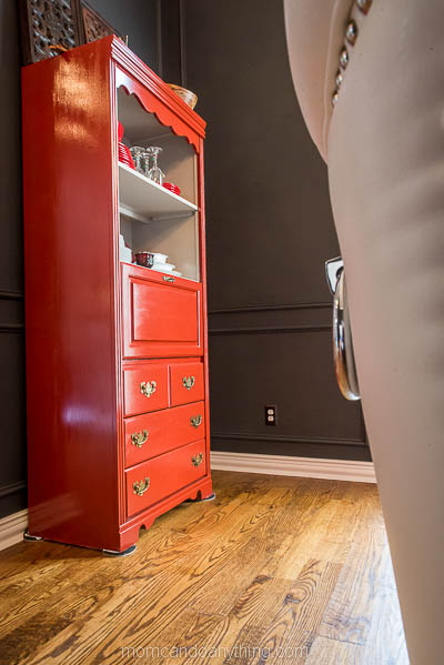 Pick a color scheme that compliments your room and the piece. With this piece I knew I wanted to store my red dishes I got when I got married and my great-grand mother’s china which is white. I wanted a predominately red piece to go with my current color scheme, but I did not want red on the inside where I planned to store my red dishes. The red I chose was actually a color match from a cabinet I had painted in another room, but it is very similar to Roycroft Copper Red from Sherwin Williams. I chose to put gray on the inside where the dishes were going and I chose to use the same gray I had on my walls in the rest of the front of the house, requisite gray.