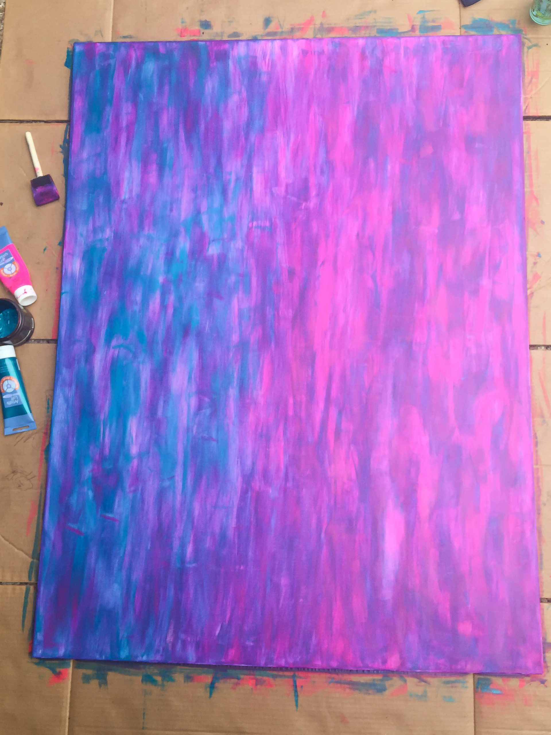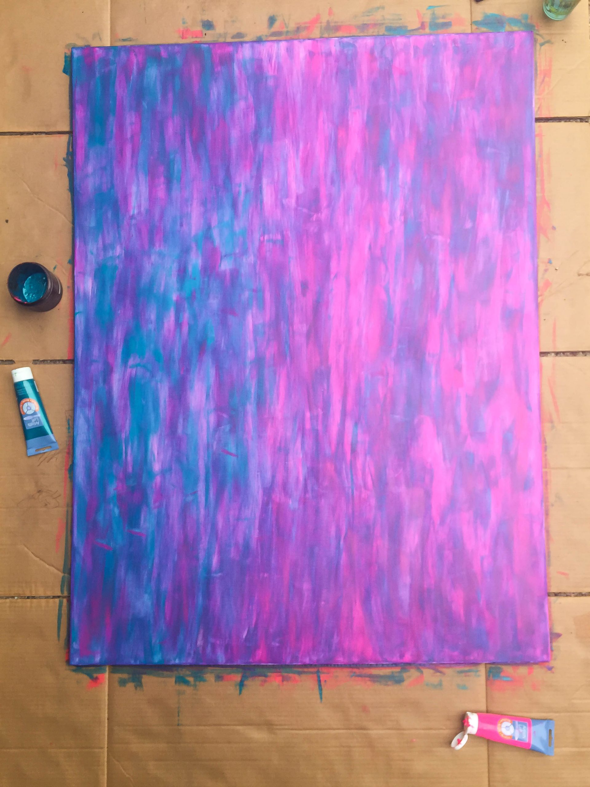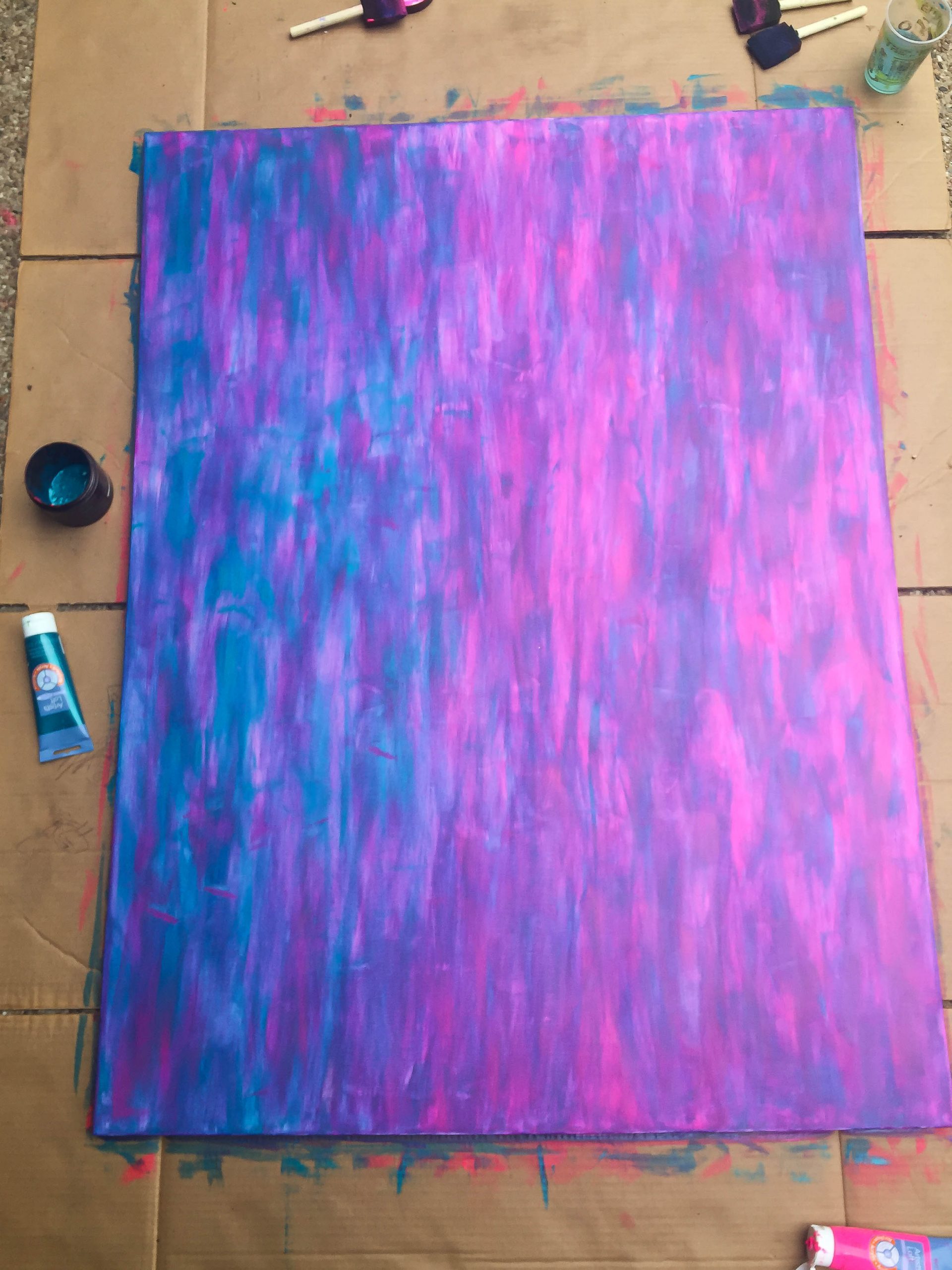 - We used a pretty fluorescent pink and a little bit of water to paint the entire canvas with a sponge brush. We both really liked the pink and I had imagined a pink background for this project.