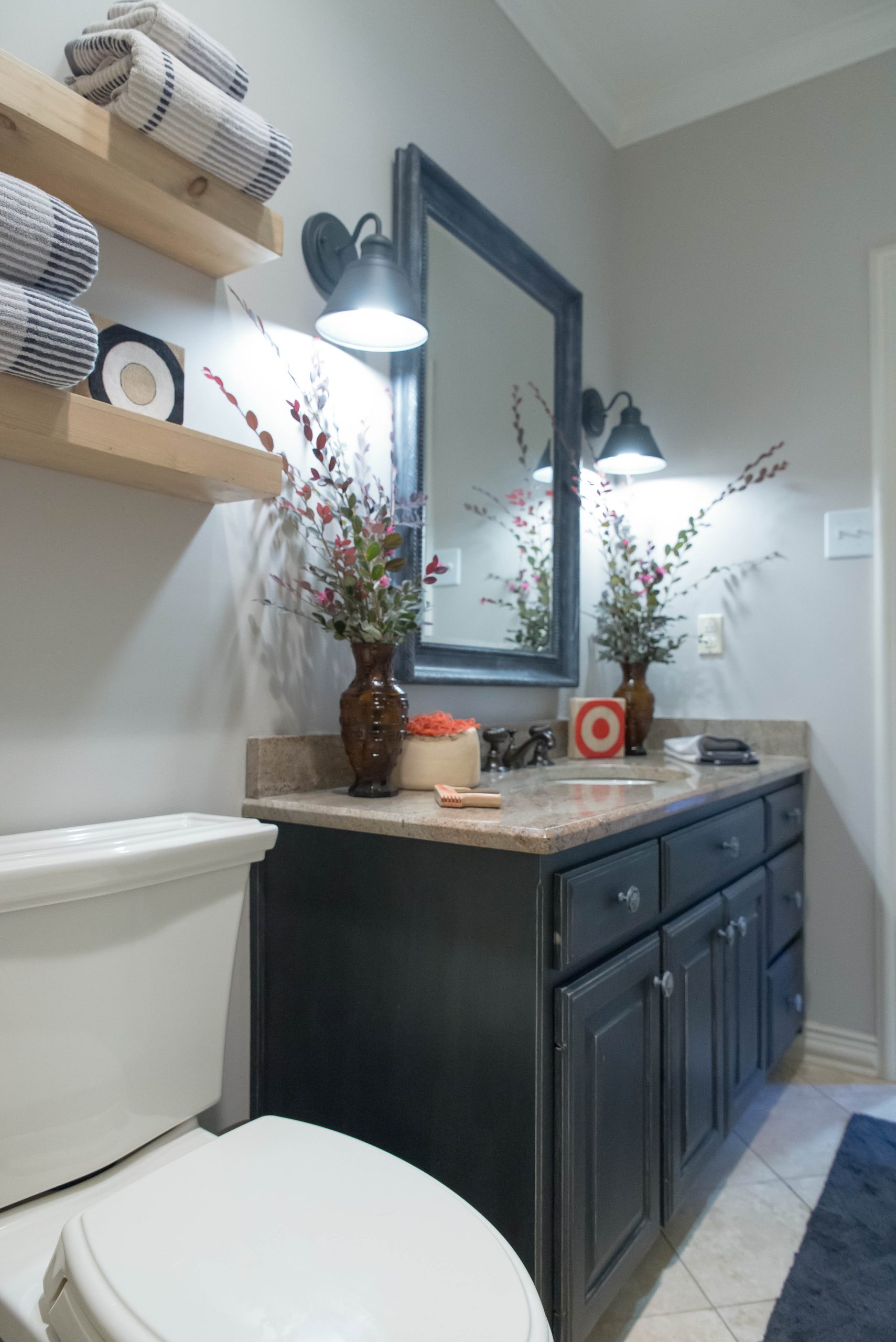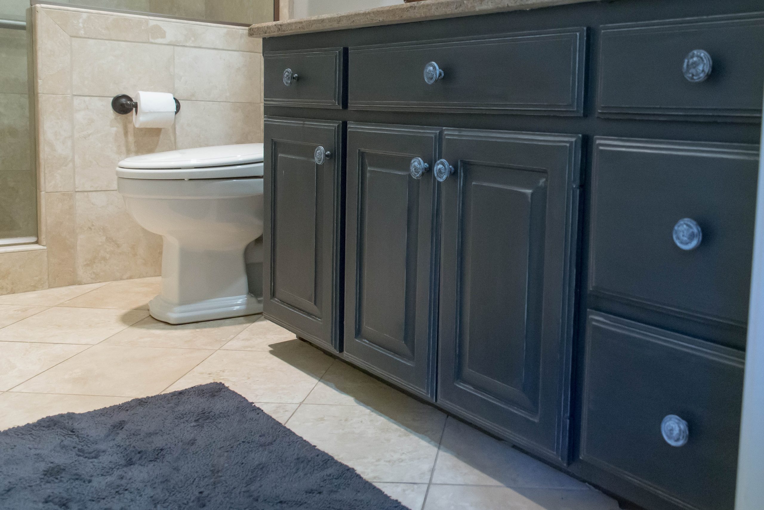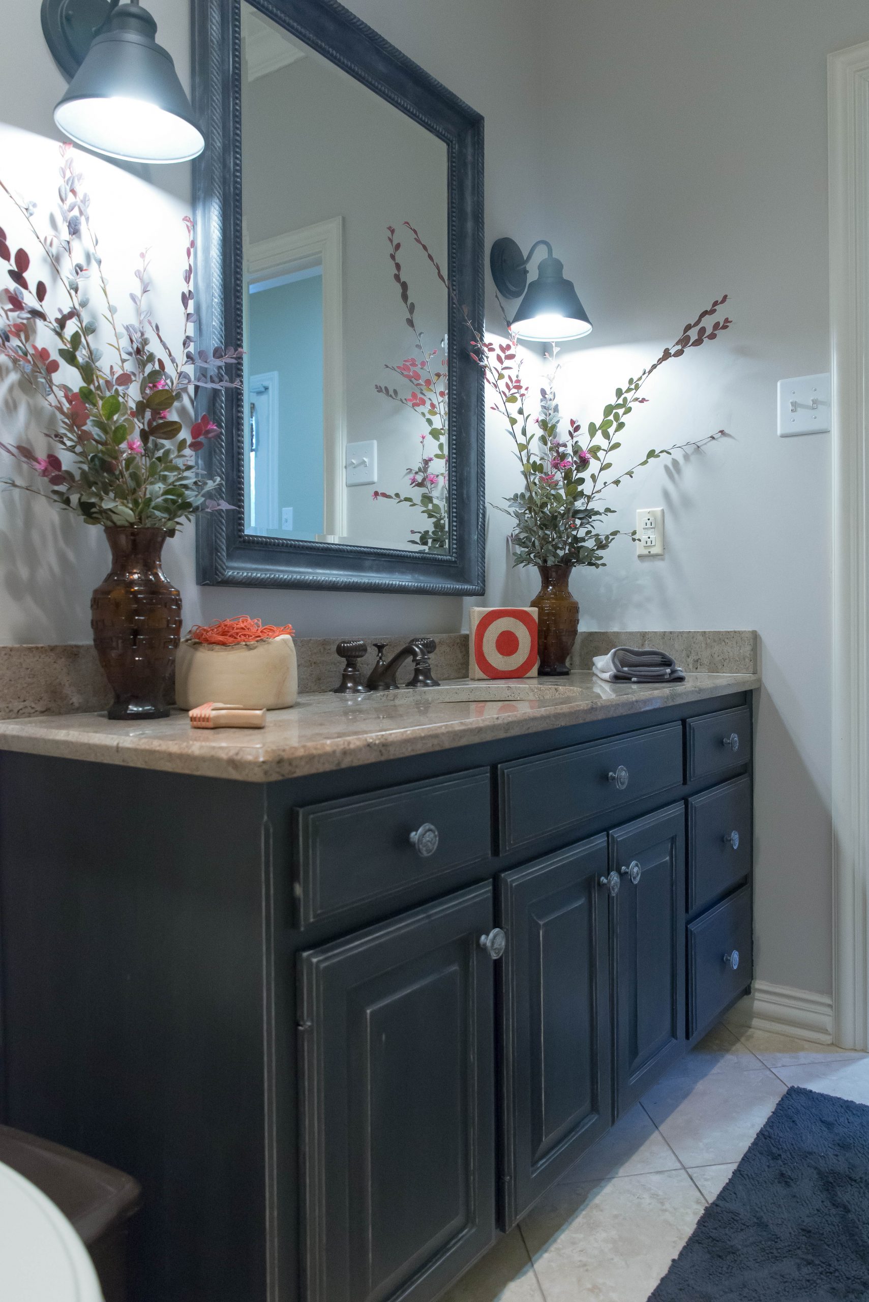 As you can see in the pictures above, my cabinets were white. The granite is somewhat brownish with dark gray specks. Since I went with such a light colored wall, I decided to do a really dark cabinet. I loved it. I think it really grounds the vanity area and makes it more of a feature. It compliments the granite and adds great contrast to the tile.