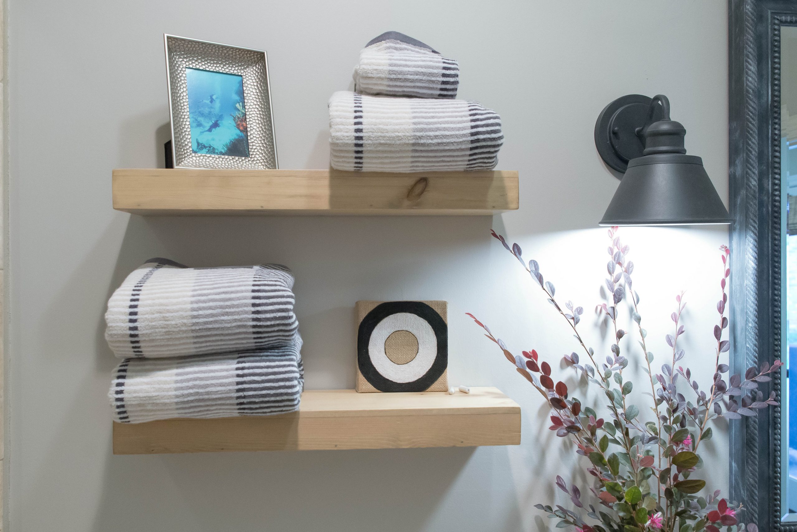 I hung ledge shelves I found at Target and added some towels I also found at Target that I thought tied all the colors together. The color of the shelves also tied in with the color of the tile.