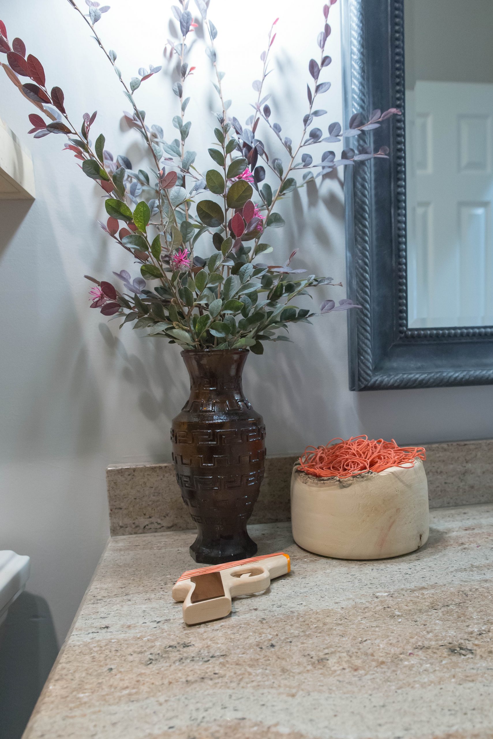 Finally, I added a little fun to this bathroom with targets and a rubber band gun. Yep, that’s right – a rubber band gun. The kids and I painted some targets on a few burlap canvases I had sitting in my office waiting for inspiration to strike. We also added a large bowl of rubber bands so you never run out of ammo. I did paint a large canvas with chalk paint and draw targets on it and it is hanging on the wall, but I have a great idea for a printable target that I will post soon. The gun and rubber bands you can find at www.elasticprecision.com.