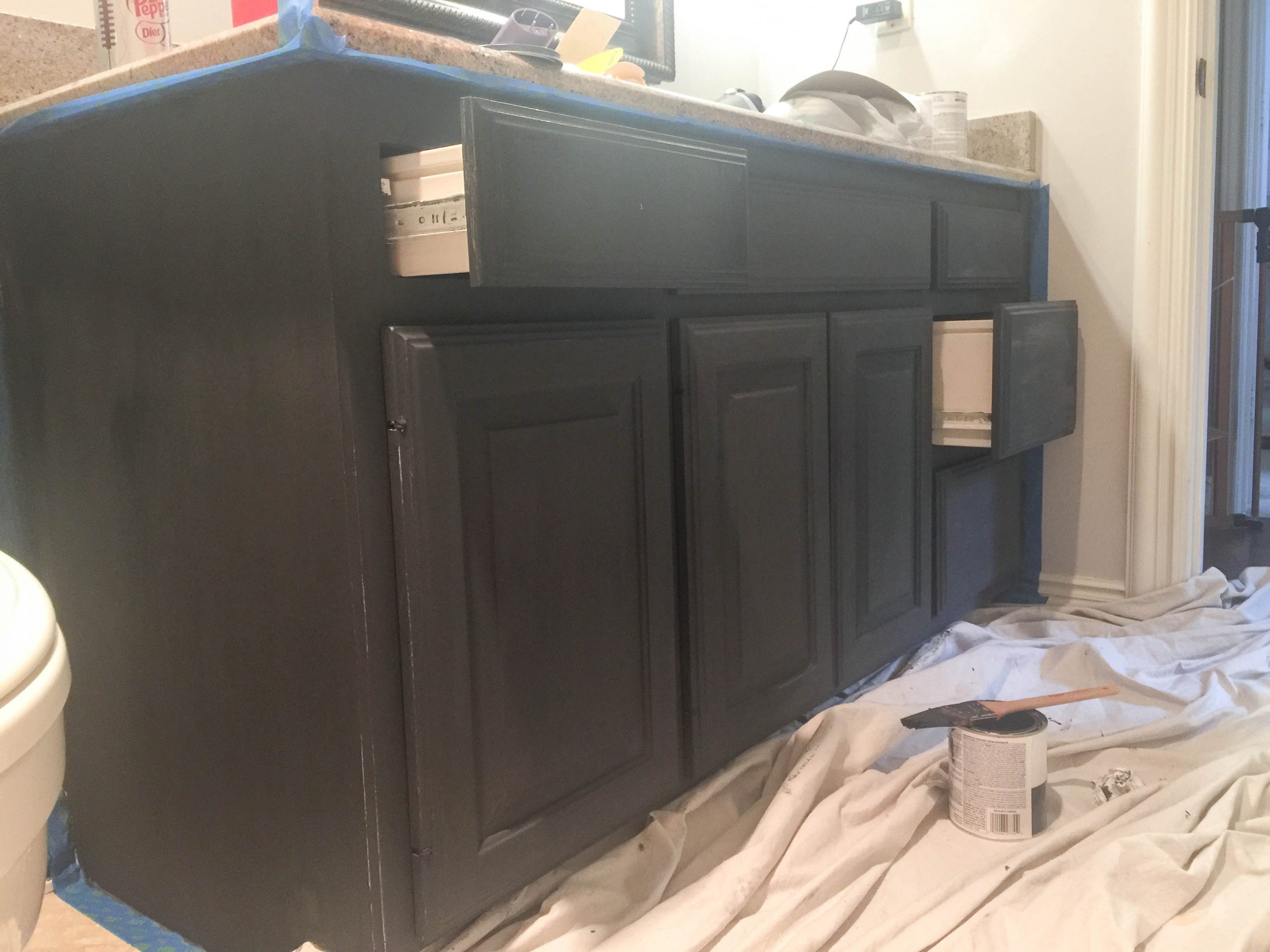 Before I painted the rest, I sanded down the shine on the outside of the cabinets with a little sandpaper. Not a major sanding, just enough to get rid of the shine.