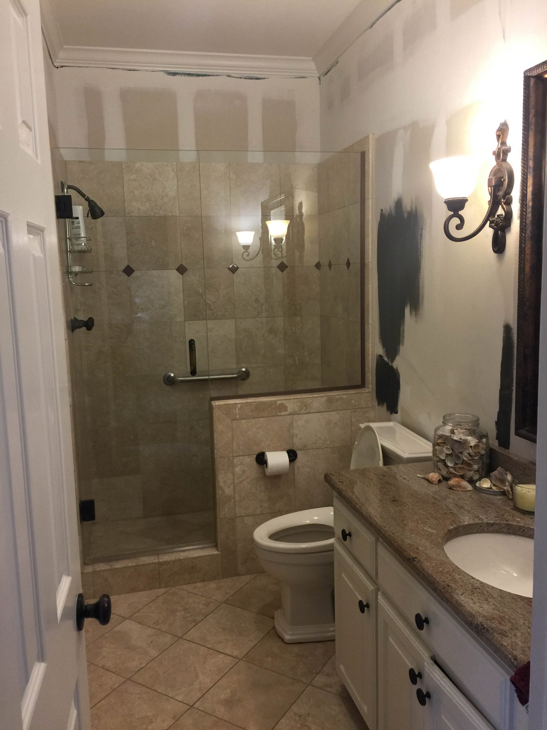 When we bought our house about seven years ago, the existing bathroom had been recently remodeled with a new shower and granite counter top. It wasn’t completely offensive, but as I lived with it for years and years, I began to hate the wallpaper. It had some french words on it that you could barely read and it really started to drive me crazy. Here is the picture that is still on Zillow.