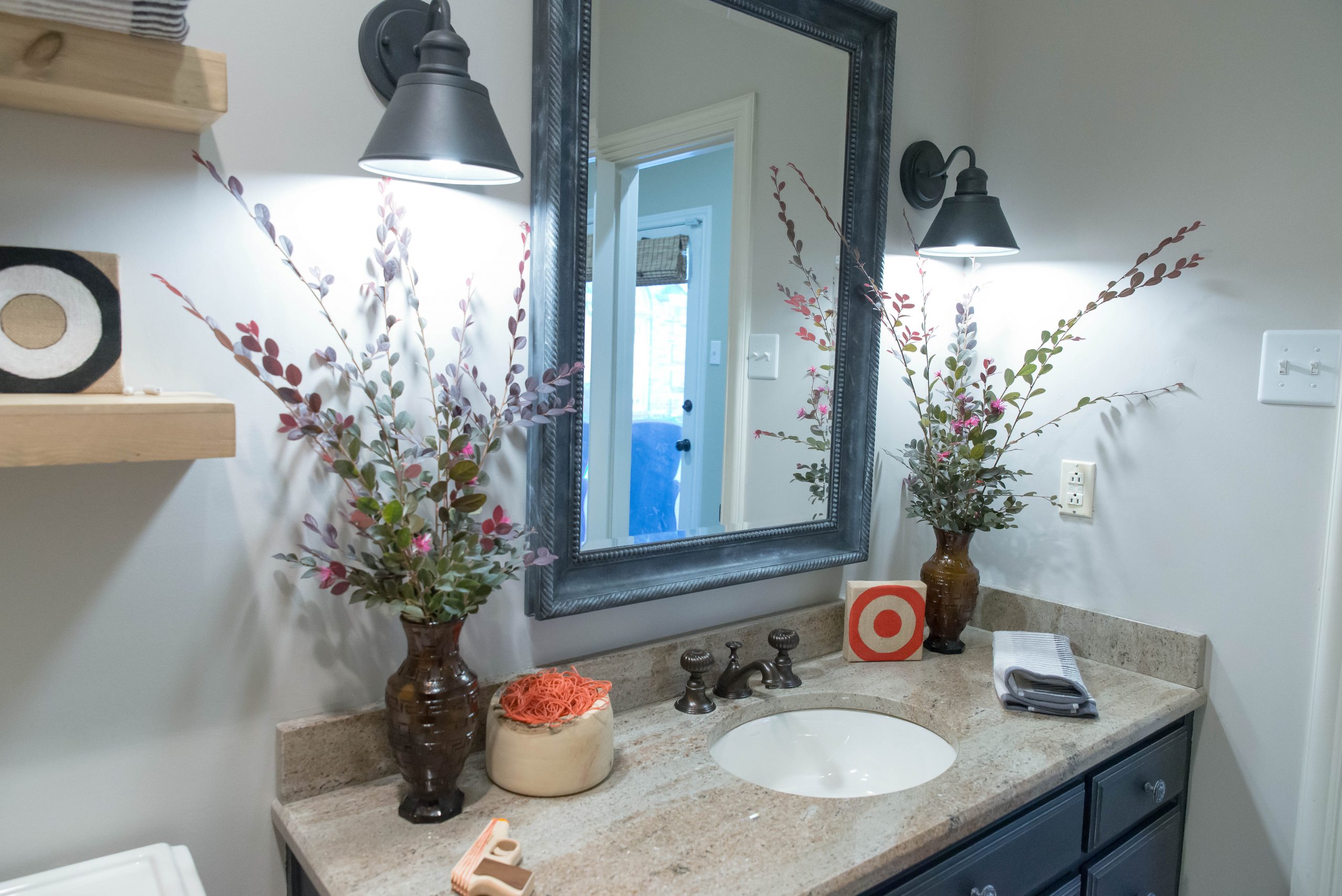 Finally, I added a little fun to this bathroom with targets and a rubber band gun. Yep, that’s right – a rubber band gun. The kids and I painted some targets on a few burlap canvases I had sitting in my office waiting for inspiration to strike. We also added a large bowl of rubber bands so you never run out of ammo. I did paint a large canvas with chalk paint and draw targets on it and it is hanging on the wall, but I have a great idea for a printable target that I will post soon. The gun and rubber bands you can find at www.elasticprecision.com.