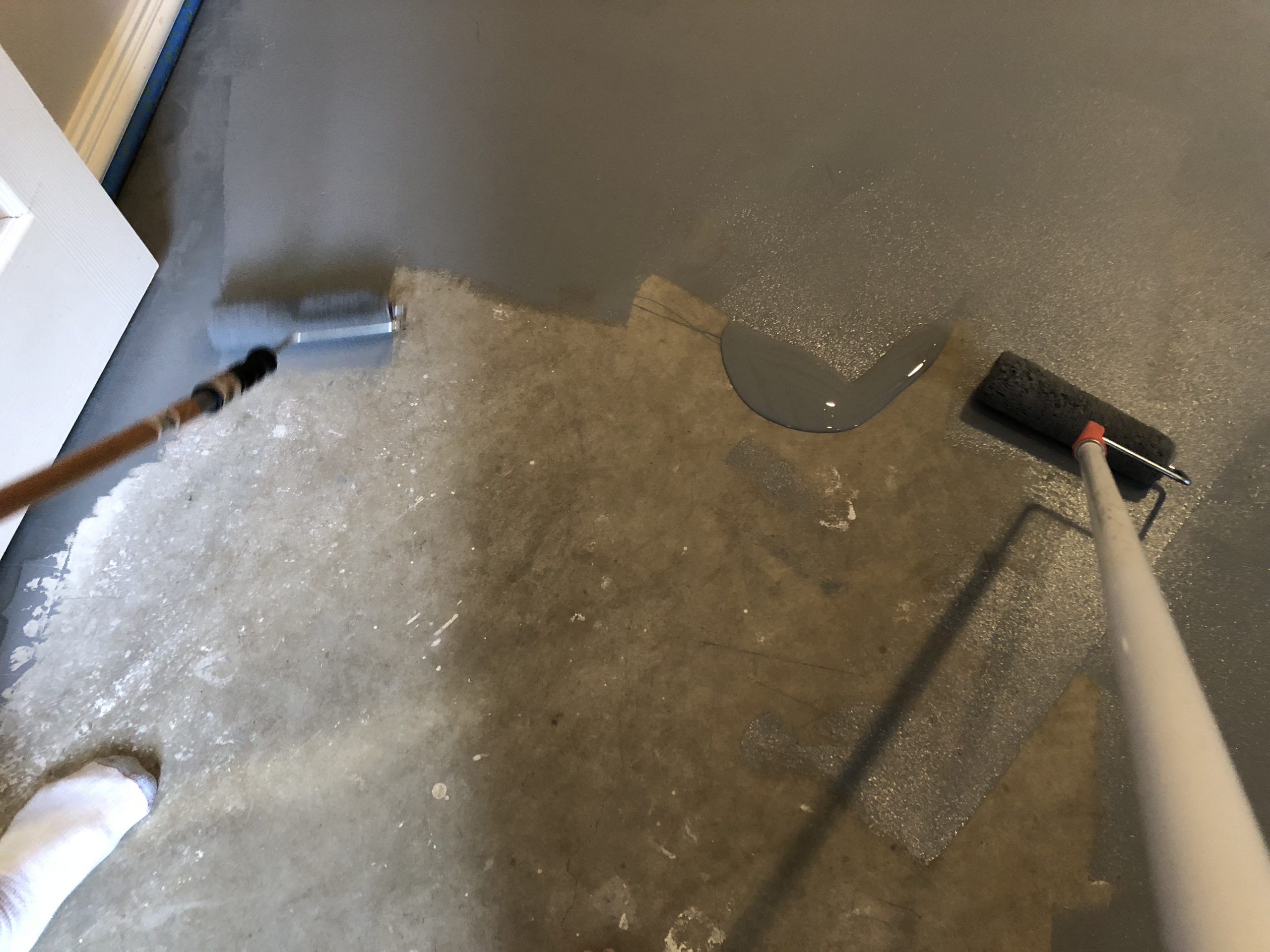 - Painted concrete floors are slippery. I have almost slipped on the floor going from the shower to the closet, so you will need rugs with non-slip pads. It’s also slippery for dogs.
